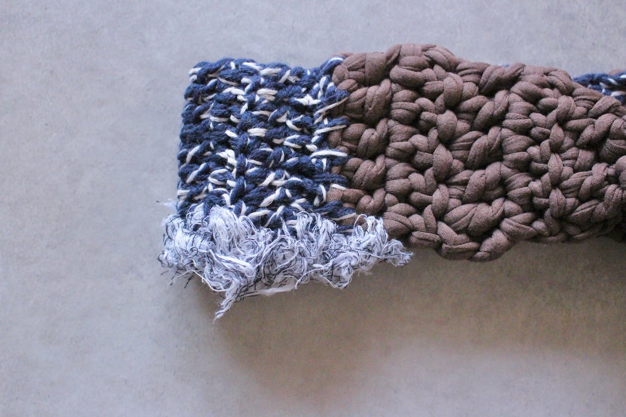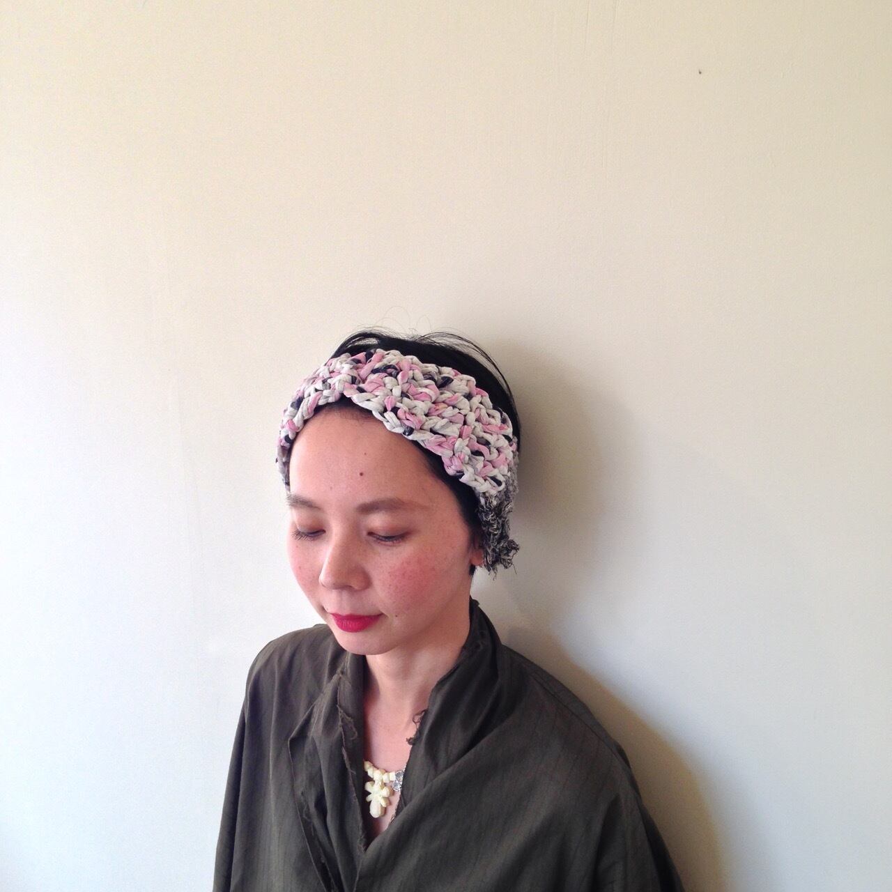アパレルメーカーの洋服を作る際に、裁断してできた布を、糸状にアップサイクルしたTシャツヤーンを使用したターバンです。